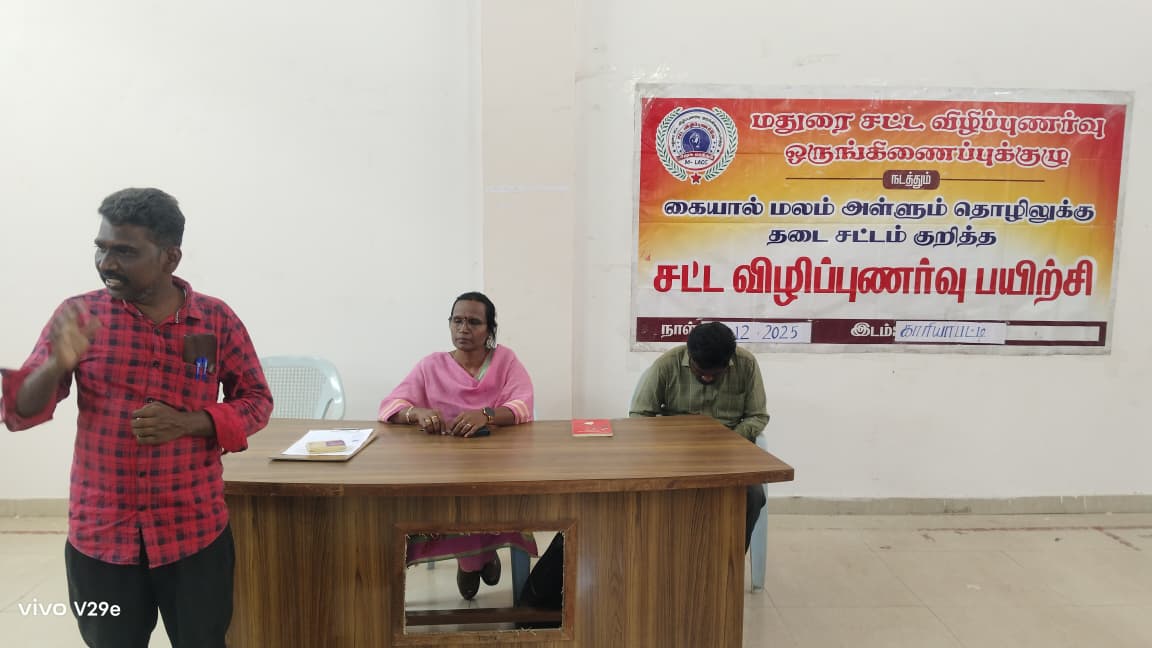 The main objective is to work towards the eradication of Manual Scavenging as per the law in force in India, namely, “The Prohibition of Employment as Manual Scavenging and their Rehabilitation Act, 2013”. While covering two districts in Tamil Nadu, Madurai and Virudhunagar, the Madurai Legal Awareness and Coordination Team, is making a lot of efforts for the implementation of this Act through field-based activities by providing awareness of the law to the workers and the government officials in the local panchayat bodies. Besides, the team is engaged in imparting special training to around 40 selected workers who are very active in each district, to empower them to take up the issues of the workers in their respective areas. Moreover, the team has set up 15 evening study centers in the two districts to help the children of the workers to pursue their studies and to motivate them to go for alternative jobs. Periodically, job placement programs are being conducted by the team.